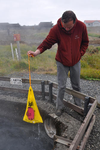 После этого мы поехали дальше на юг, в сторону Рейкьявика. По пути заезжали на геотермальный источник Дейльдартунгюхвер неподалеку от города Боргарнес. Этот мощный источник снабжает горячей водой все окрестные населенные пункты, а поскольку температура воды там 97°C, то в ней можно без проблем варить яйца (что мы и сделали! Big smile image )