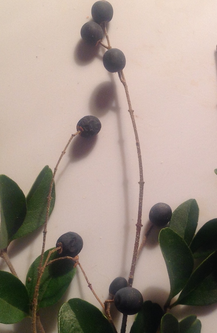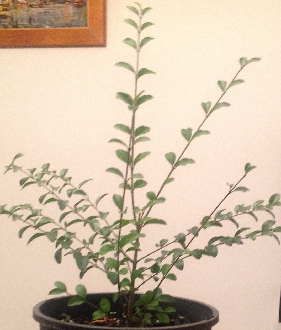 Размеры листьев 25 х 13 мм. Верхняя сторона глянцевая темно-зеленая. Нижняя светлее и матовая. Расположение листьев строго супротивное. Расстояние между листьями от 20 до 40 мм. Вечнозеленое растение.