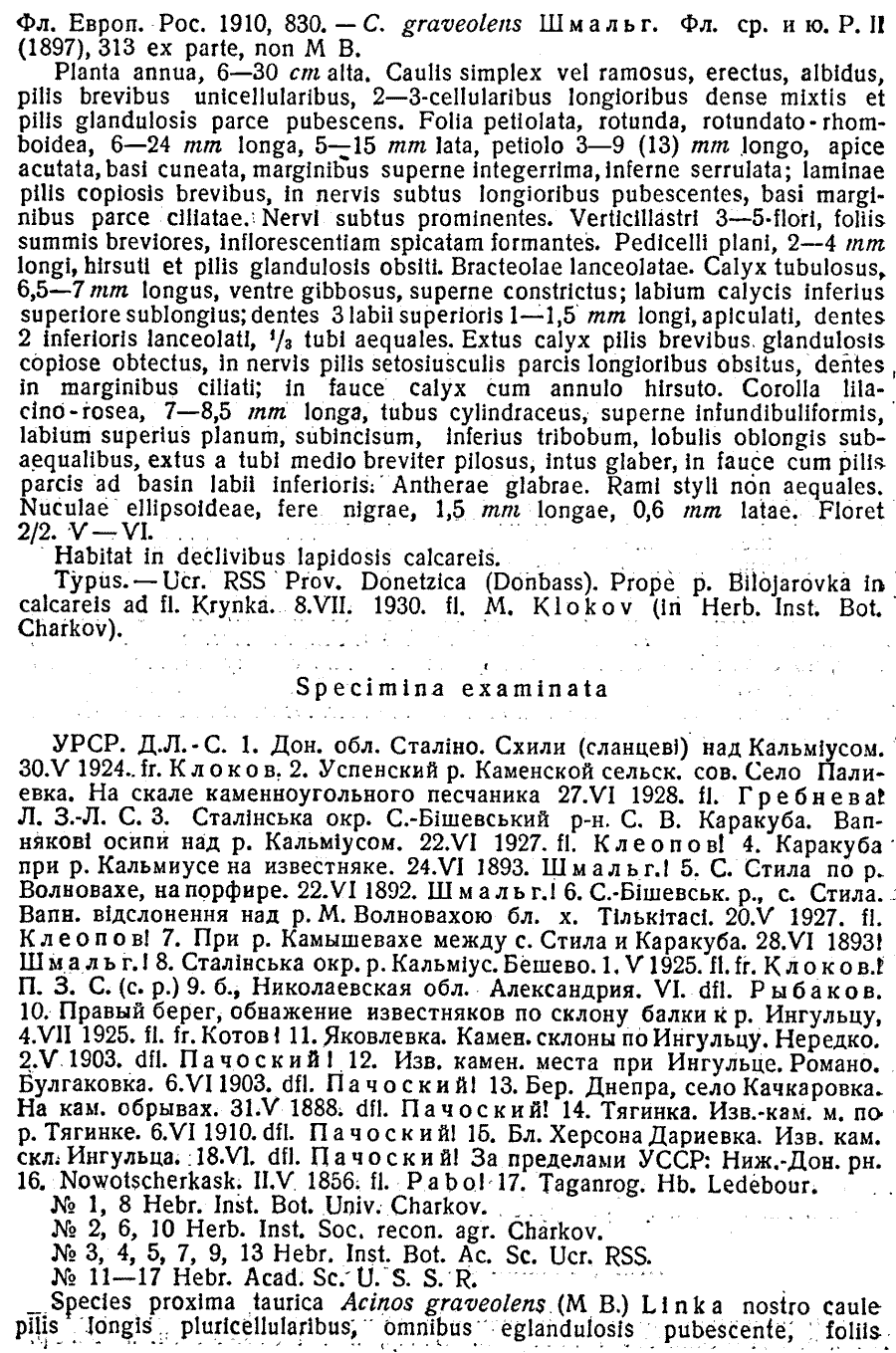 Смущает то, что в нашей базе (и в "Черепанове") Acinos graveolens (Bieb.) Link - синоним Acinos rotundifolius J. Persson, тогда как в Euro+Med Acinos rotundifolius Pers. считается синонимом Clinopodium graveolens subsp. rotundifolium (Pers.) Govaerts. Т.о. синонимизация Acinos graveolens (Bieb.) Link с Acinos rotundifolius выглядит не совсем корректной.