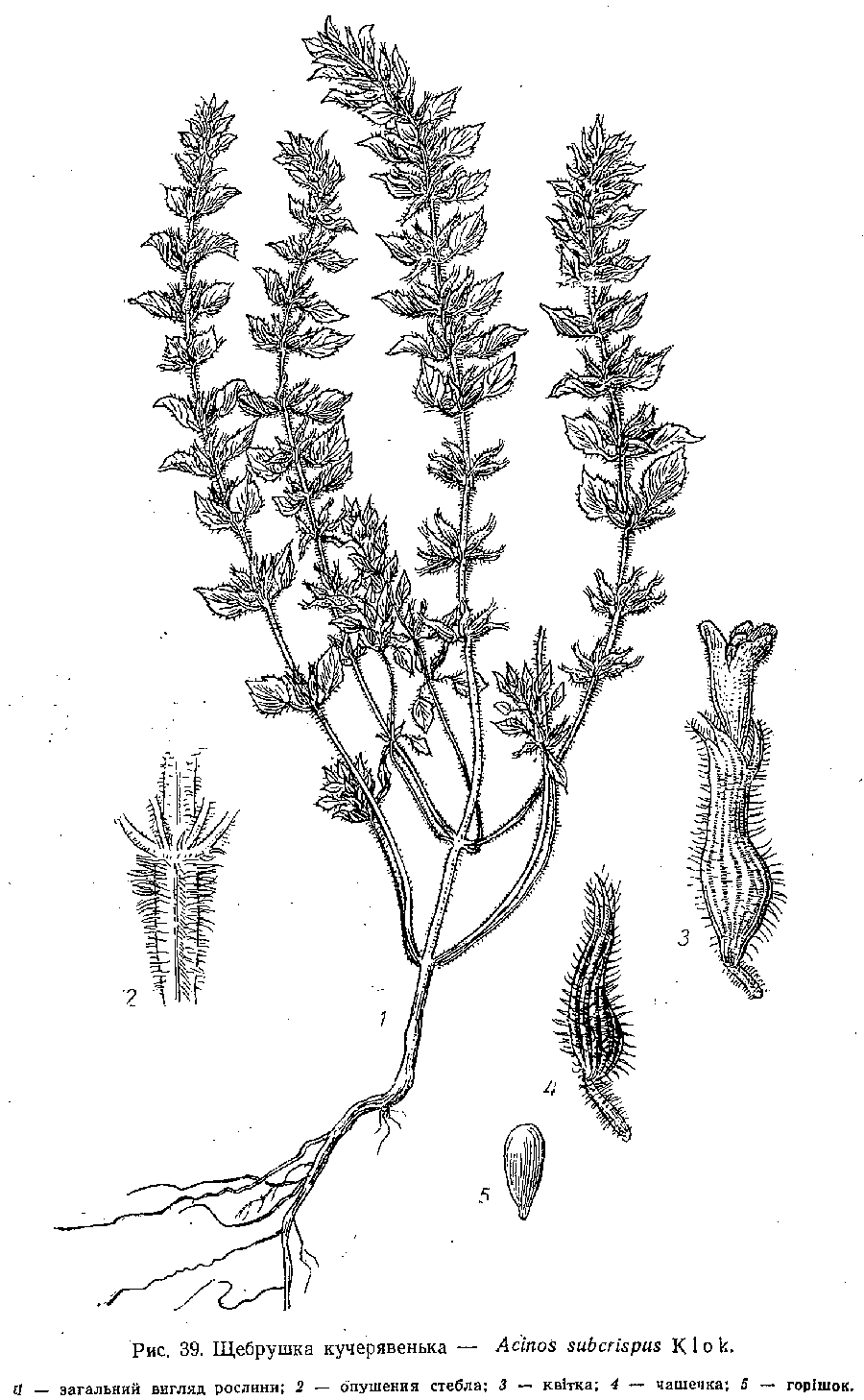 | Andriy Kovalchuk | Рисунок Acinos graveolens (M. Bieb.) Link из издания "Флора СССР", т. 21, табл. XXIII (облик растения, развёрнутый венчик, орешек, лист, чашечка):