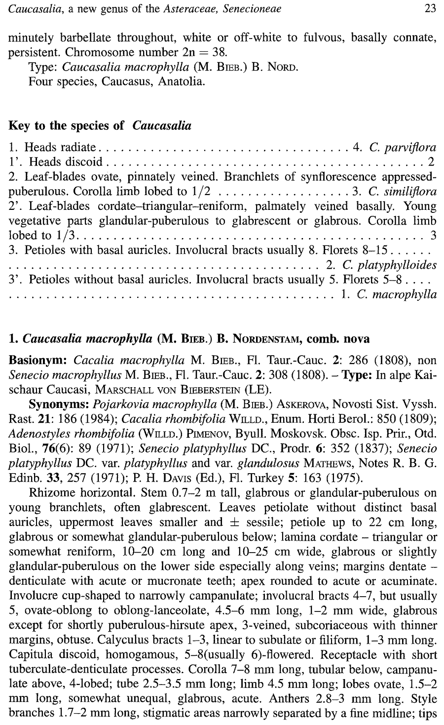 | Andriy Kovalchuk | Протолог рода Caucasalia B. Nord. (Plant Systematics and Evolution 206(1-4): 22. 1997; тип: Caucasalia macrophylla (M. Bieb.) B. Nord. (≡ Cacalia macrophylla M. Bieb.  :