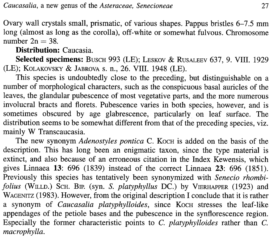 | Andriy Kovalchuk | Обнародование комбинации Caucasalia platyphylloides (Sommier & H. Lév.) B. Nord. (Plant Systematics and Evolution 206(1-4): 25. 1997):