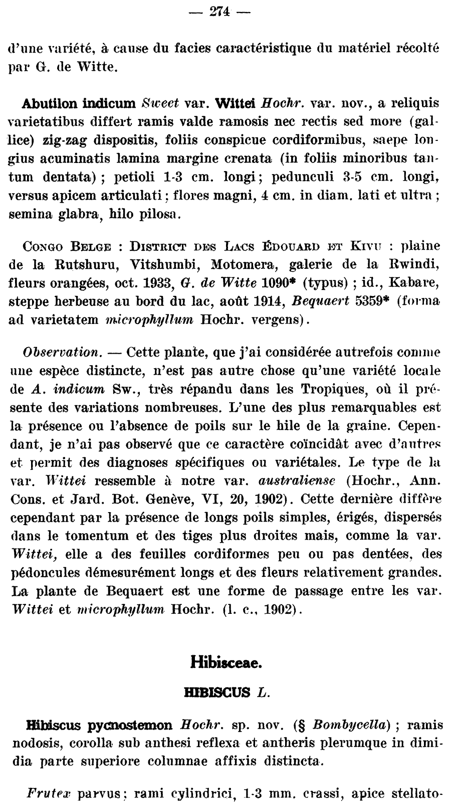 Протолог Abutilon indicum var. wittei Hochr. (Bulletin du Jardin botanique de l'État a Bruxelles 18(3-4): 274. 1947):