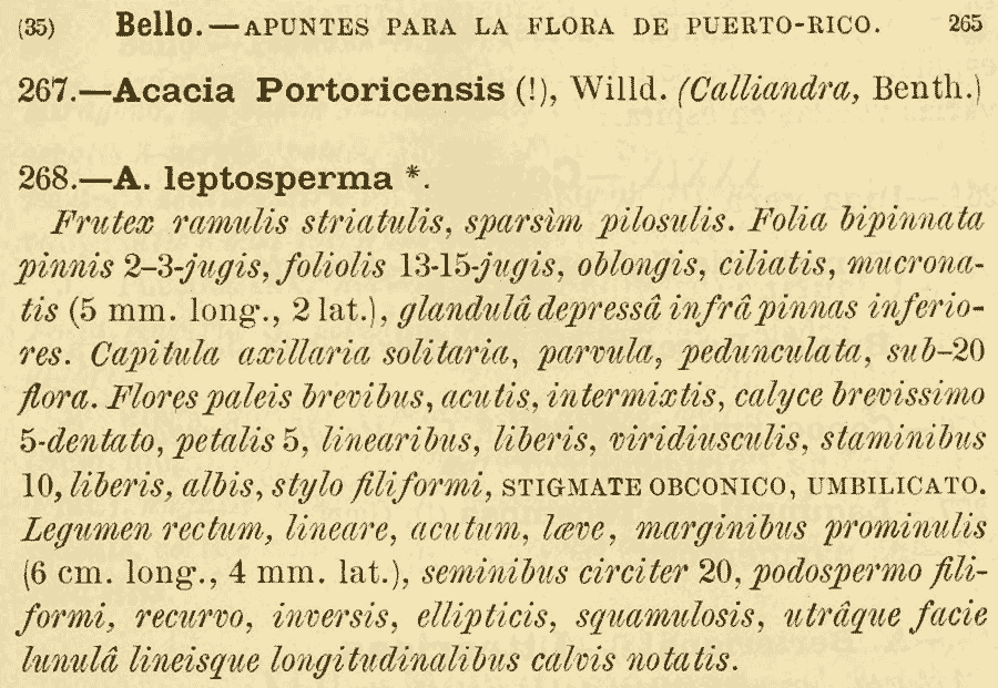 Протолог Acacia leptosperma Bello (Anales de la Sociedad Española de Historia Natural 10: 265. 1881):