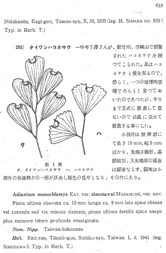 Протолог Adiantum monochlamys var. simozawai Masam. (Transactions of the Natural History Society of Taiwan 33: 619, f. 1. 1943):