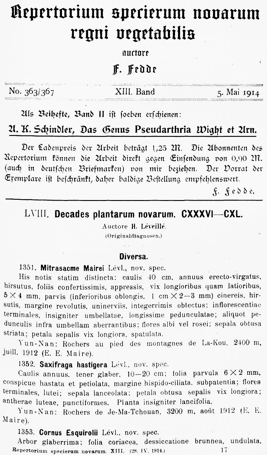 Протолог Cornus esquirolii H. Lév. (Repertorium Specierum Novarum Regni Vegetabilis 13(363–367): 257–258. 1914):