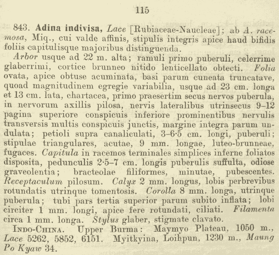 Протолог Adina indivisa Lace (Bulletin of Miscellaneous Information, Royal Gardens, Kew 1915: 115. 1915):