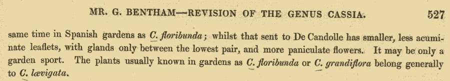 | Andriy Kovalchuk | Название Cassia laevigata Willd. в настоящее время считается синонимом не Senna floribunda, а Senna septemtrionalis. Большинство источников, приведённых в Tropicos, следует такой точке зрения: