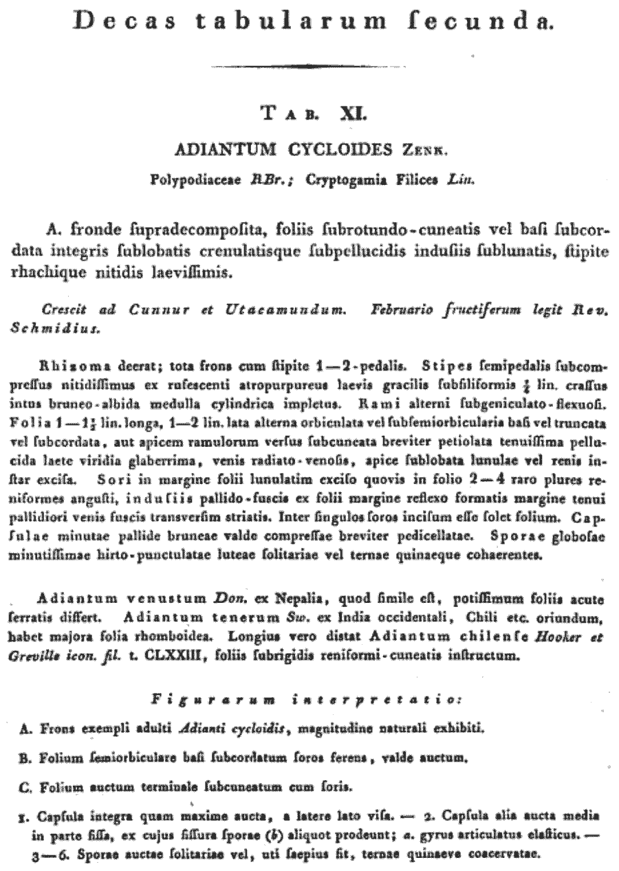 | Andriy Kovalchuk | Протолог Adiantum cycloides Zenker (Plantae Indicae, quas in montibus Coimbaturicis coeruleis, Nilagiris. Neilgherries dictis, collegit Rev. Bernhardus Schmid: 11, t. 11. 1835):