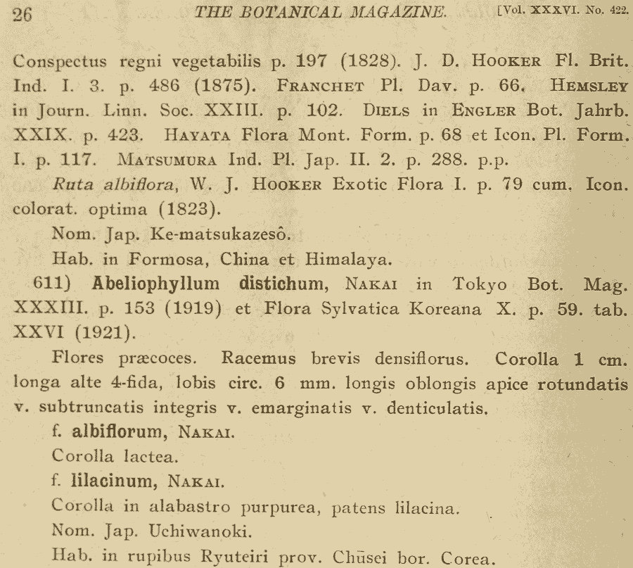 | Andriy Kovalchuk | Протолог Abeliophyllum distichum f. albiflorum Nakai и Abeliophyllum distichum f. lilacinum Nakai (Botanical Magazine (Tokyo) 36: 26. 1922):