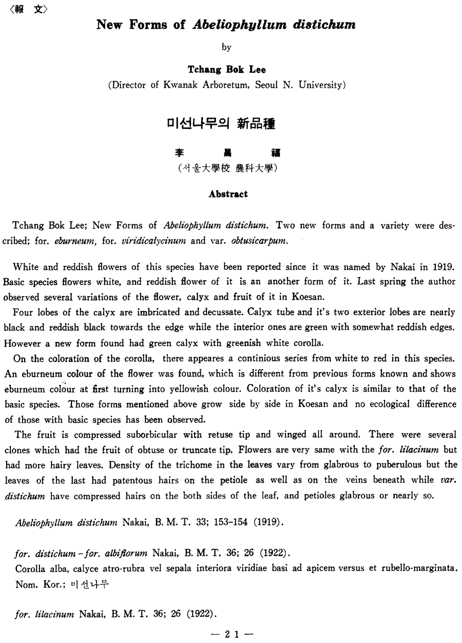 | Andriy Kovalchuk | Протолог Abeliophyllum distichum f. eburneum T. Lee, Abeliophyllum distichum var. obtusicarpum T. Lee и Abeliophyllum distichum f. viridicalycinum T. Lee (Journal of Korean Plant Taxonomy 7: 22. 1976):