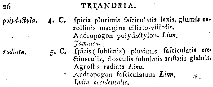 Протолог рода Chloris Sw. (Nova Genera et Species Plantarum seu Prodromus [O. P. Swartz]: 1, 25. 1788; лектотип: Chloris cruciata (L.) Sw. (≡ Agrostis cruciata L.), designated by Hitchcock, A. S. 1920. The genera of grasses of the United States. U.S.D.A. Bull. (1915-23) 772: 187):