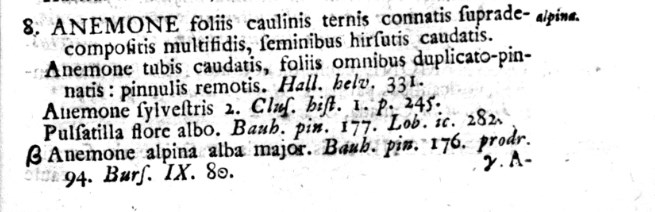 Да, действительно, "классические" Линнеевские виды прострелов,- pratensis, patens, vernalis - все Anemone у Линнея, и Anemone pulsatilla(=Pulsatilla vulgaris) отнесены к Anemone у Шранка. ! За исключением Anemone alpina, которая Шранком отнесена к ветренницам. Что и означает, думаю, фразу "published as Anemone alpina". |