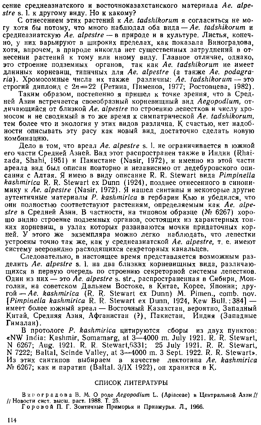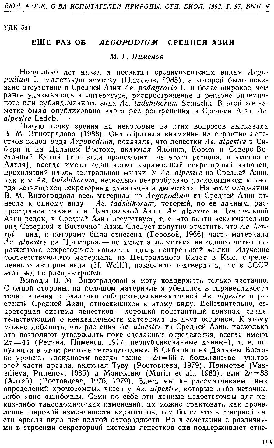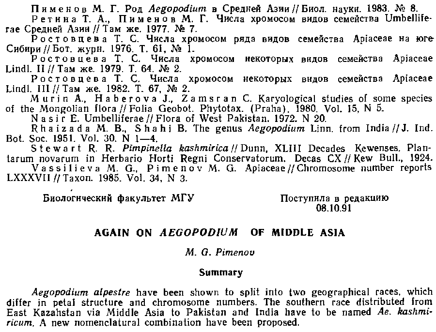 | Andriy Kovalchuk | Обнародование комбинации Aegopodium kaschmiricum (R. Stewart ex Dunn) Pimenov (Бюллетень Московского общества испытателей природы, отдел биологический 97(4): 114. 1992):