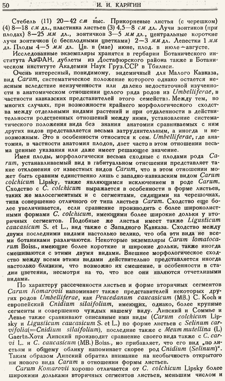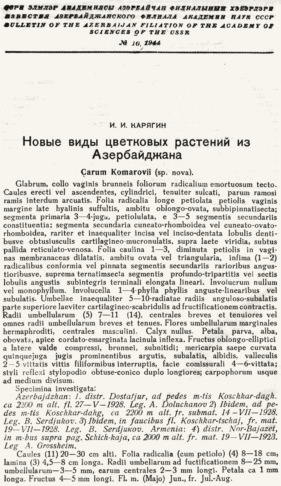 Протолог Carum komarovii Karjagin (Известия Азербайджанского филиала Академии наук СССР 10: 48. 1944):