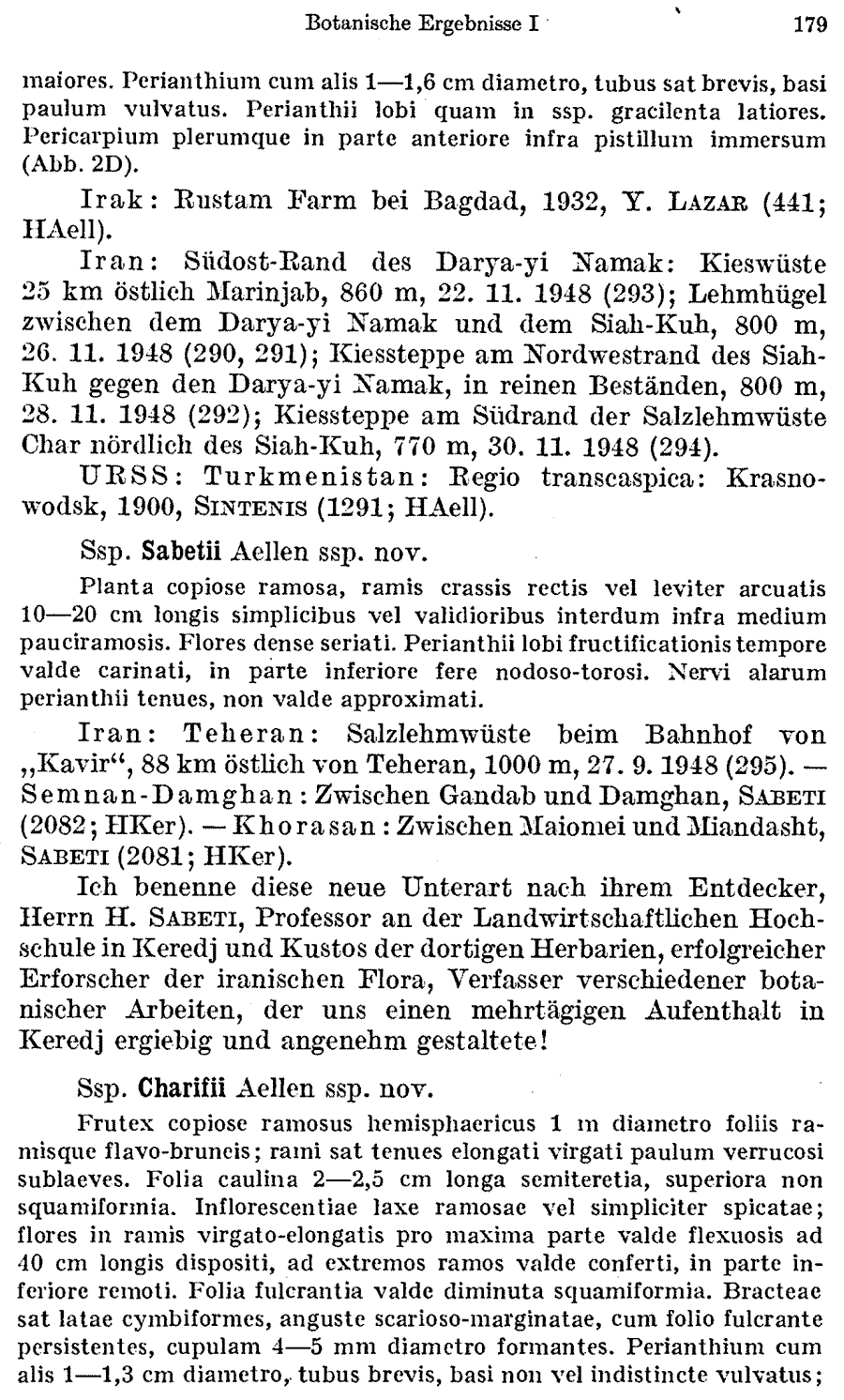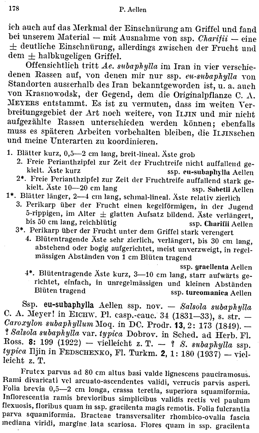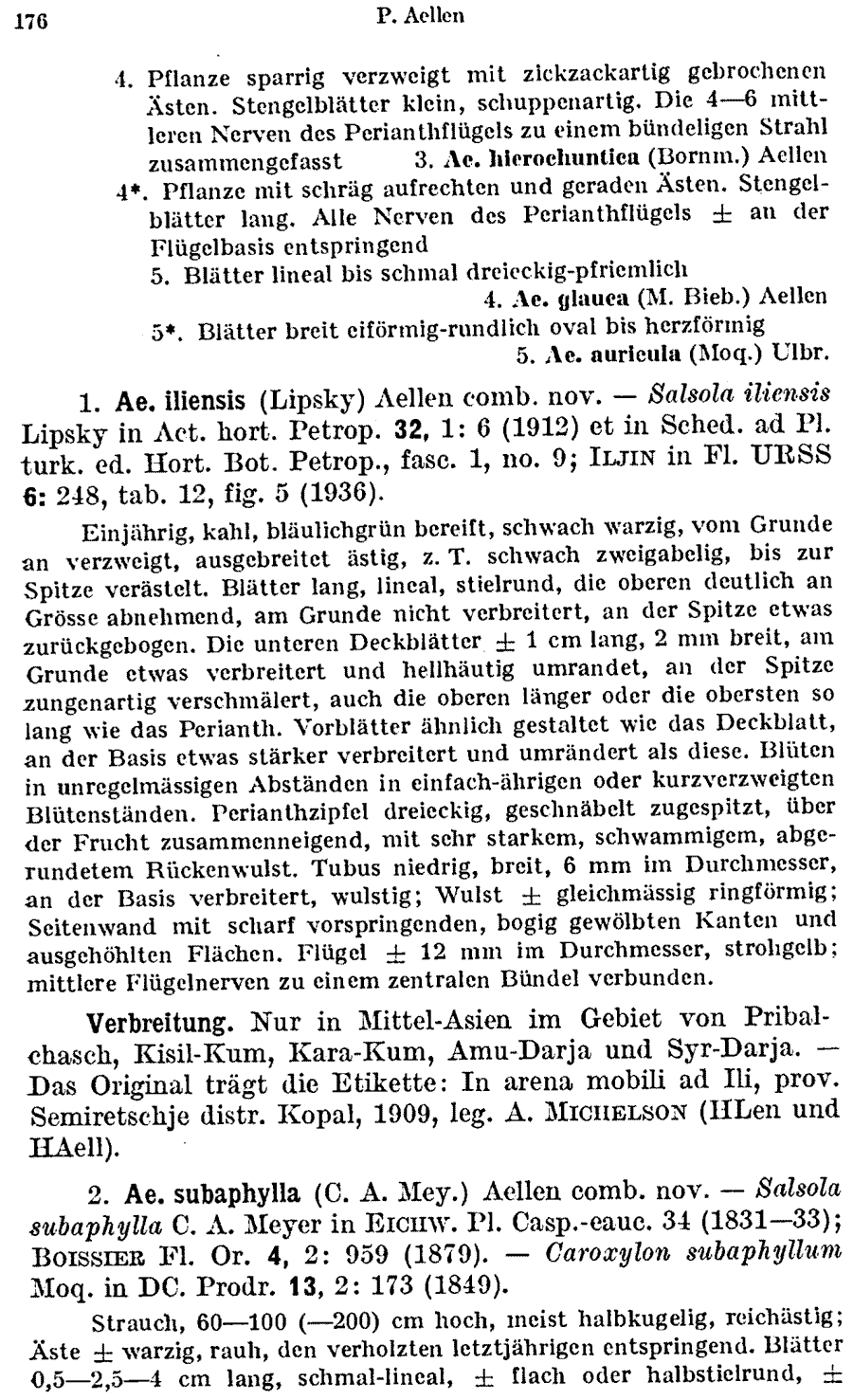 Обнародование комбинаций Aellenia subaphylla ssp. eusubaphylla Aellen (Verhandlungen der Naturforschenden Gesellschaft in Basel 61: 178. 1950) и Aellenia subaphylla ssp. turcomanica Aellen (Verhandlungen der Naturforschenden Gesellschaft in Basel 61: 180. 1950):