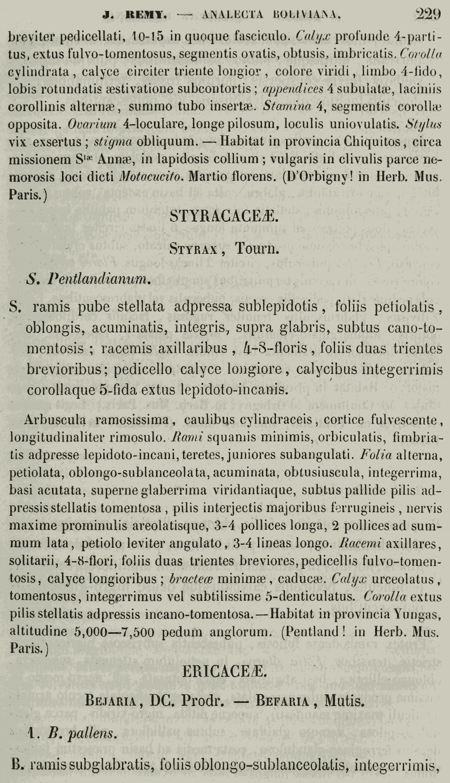 Протолог Bejaria pallens J. Rémy (Annales des Sciences Naturelles; Botanique, sér. 3, 8: 229. 1847) и Bejaria denticulata J. Rémy(Annales des Sciences Naturelles; Botanique, sér. 3, 8: 230. 1847):