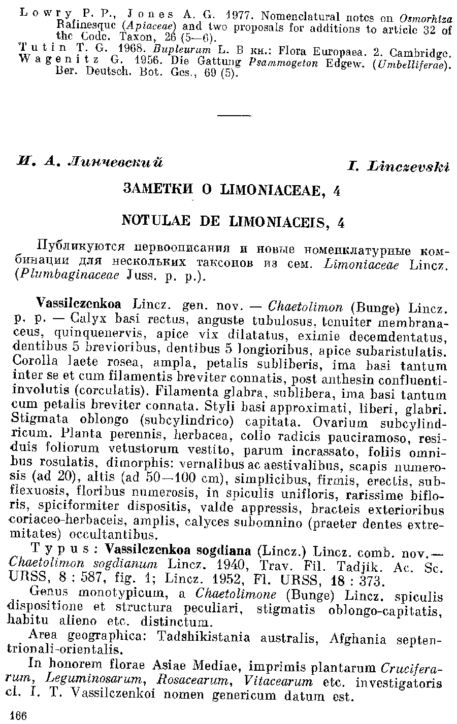 | Andriy Kovalchuk | Протолог рода Vassilczenkoa Lincz., nom. illeg. (Новости систематики высших растений 16: 166. 1979; тип: Vassilczenkoa sogdiana (Lincz.) Lincz. (≡ Chaetolimon sogdianum Lincz. ≡ Acantholimon sogdianum (Lincz.) Sennikov  :