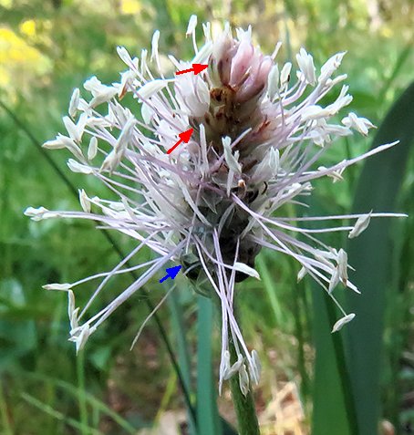| Алексей Шипунов | Да, найдите, пожалуйста. Подозрительный он какой-то. С одной стороны, есть намек на то, что листочки околоцветника короткие (синяя стрелка) и передние чашелистики сросшиеся, как у Plantago lanceolata (красные стрелки), а с другой стороны, цветонос вроде бы не ребристый. |