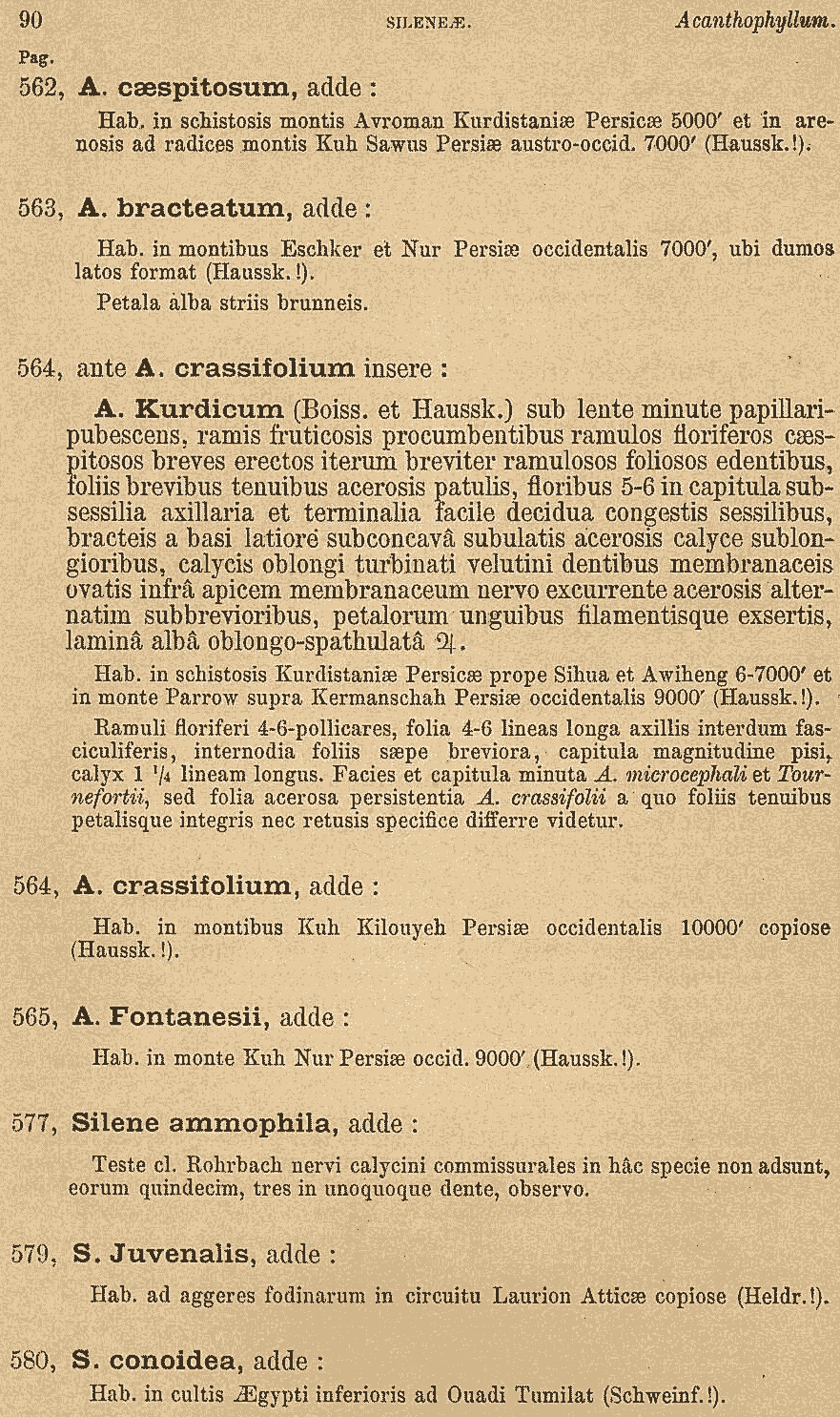 Протолог Acanthophyllum kurdicum Boiss. & Hausskn. (Flora Orientalis [Boissier] Supplementum: 90. 1888):