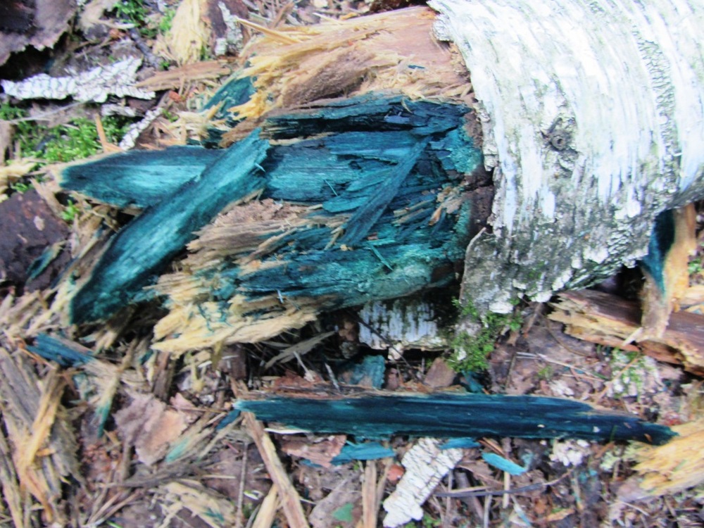 Подскажите, пожалуйста, почему труха стволов деревьев становится цветом, как облитая раствором бриллиантовой зелени? Много раз в разных лесах встречала. Цветопередача пострадала, должна быть ближе к зелёному, но цвет сложный, зелёно-синий.