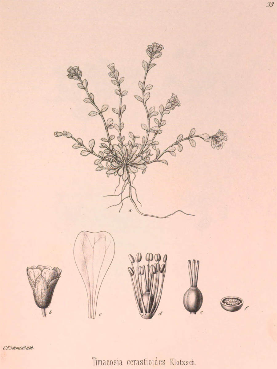 Протолог рода Timaeosia Klotzsch (Die botanischen ergebnisse der reise Seiner Königl. Hoheit des prinzen Waldemar von Prussen in den jahren 1845 und 1846 [Klotzsch & Garcke]: 138, t. 33. 1862; тип: Timaeosia cerastioides Klotzsch (= Acanthophyllum cerastioides (D. Don) Madhani & ZarreBig smile image: