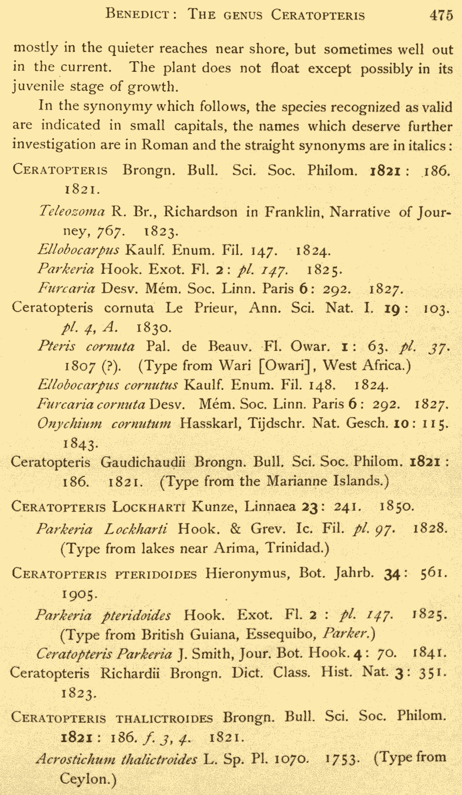 Обнародование комбинации Ceratopteris thalictroides (L.) Brongn. (Bulletin des Sciences, par la Société Philomatique 1821: 186. 1822) и протолог Ceratopteris gaudichaudii Brongn. (Bulletin des Sciences, par la Société Philomatique 1821: 187. 1822):