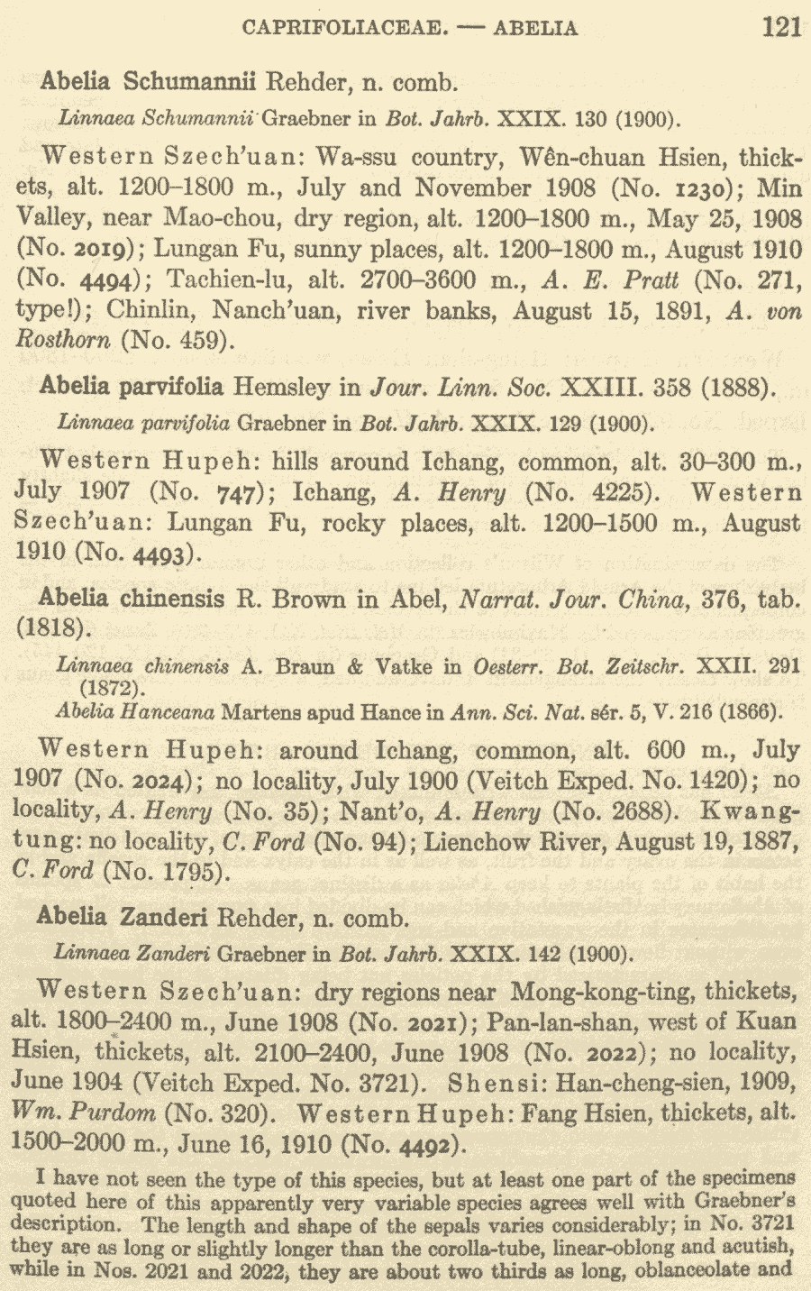 | Andriy Kovalchuk | Обнародование комбинации Abelia schumannii (Graebn.) Rehder (Plantae Wilsonianae. An Enumeration of the Woody Plants Collected in Western China for the Arnold Arboretum of Harvard University 1(1): 121. 1911 [31 Jul 1911]):