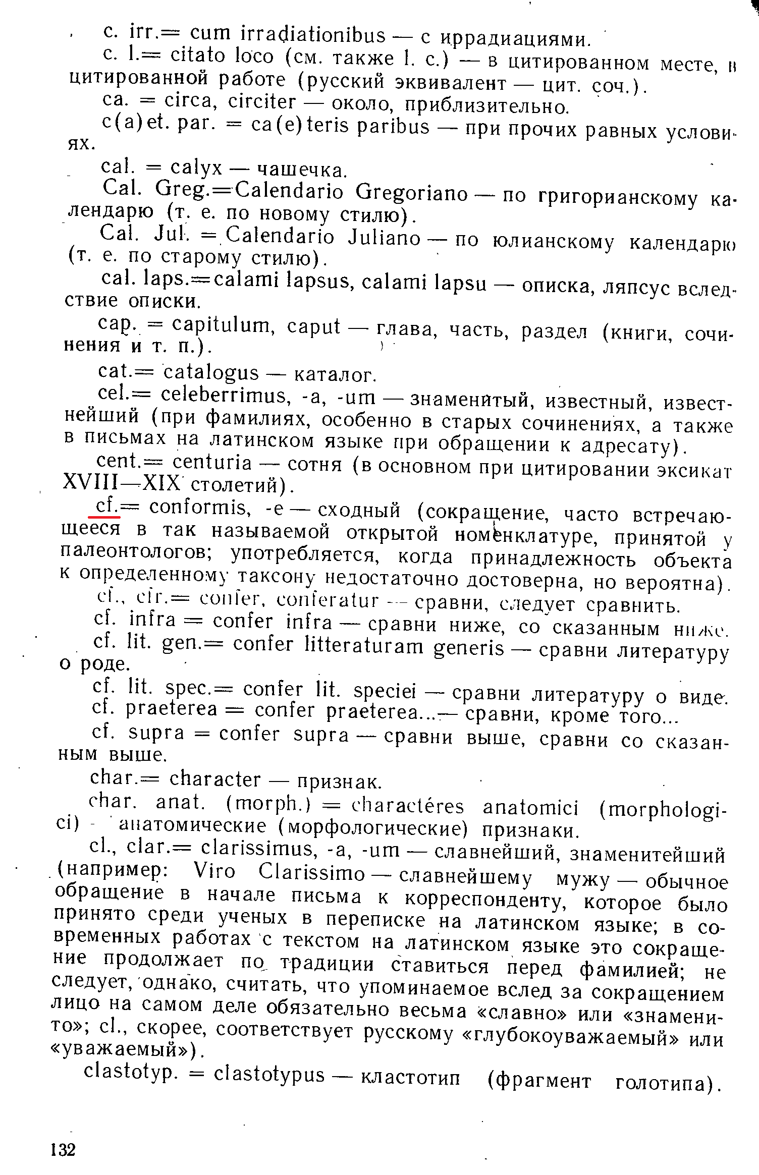 | Svetlana Kourova | Второй параграф В биологии латинский эквивалент — cf. — используется в том случае, когда сам автор не уверен в своём определении вида. Таким образом определяется наименьший уровень неуверенности — «возможно, именно этот вид». Например, лат. Littorina cf. littorea означает «моллюск из рода Литторины, скорее всего обыкновенная литорина (лат. Littorina littorea)»[5]. Более серьёзные сомнения выражаются через лат. sp.: Littorina sp. — «какой-то вид из рода Литторины» и лат. aff.: Littorina aff. brevicula — «какой-то вид из рода Литторины, но точно не brevicula, хотя и похожий». |