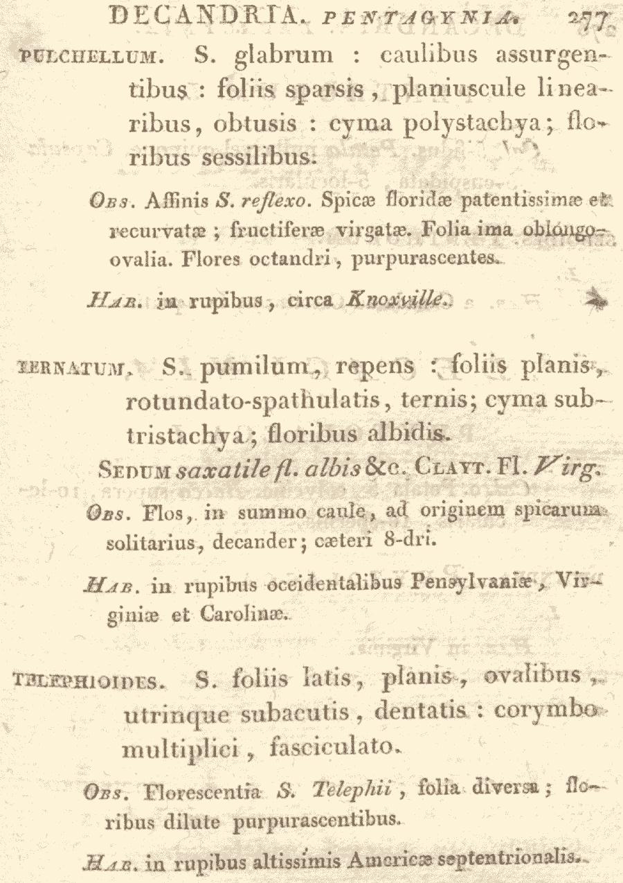 | Andriy Kovalchuk | Что касается записи Sedum pusillum Pursh, то Pursh не обнародовал собственной комбинации, а лишь процитировал название, ранее обнародованное Michaux: