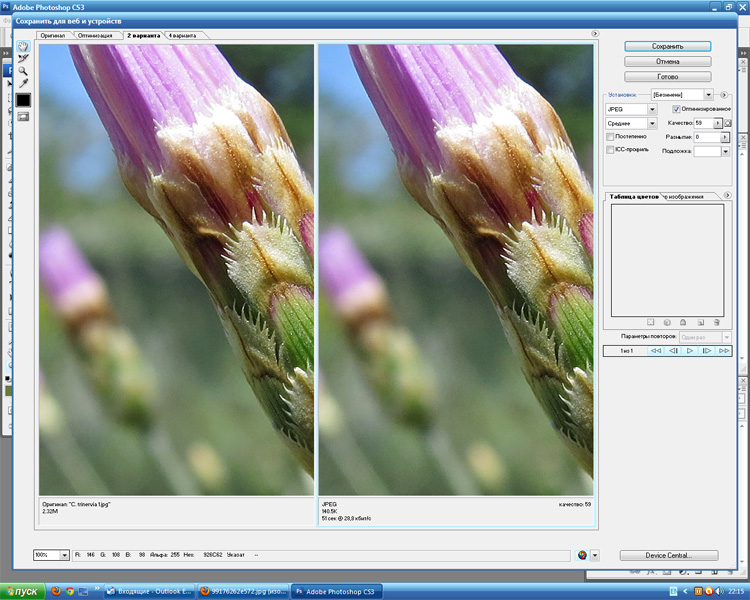 А когда сохраняем через Save As, то действуем наугад, выбирая степень сжатия. Но ведь сохраняя пейзаж или цветочек на ровном фоне при одинаковом сжатии, получим совершенно разный результат по весу. Если цветочек уложится в допустимые рамки по весу, то пейзаж вряд-ли, придется ещё раз пересохранять, увеличив степень сжатия.