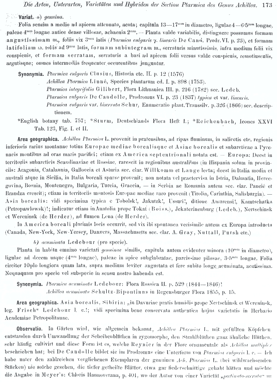 | Andriy Kovalchuk | Пока-что не смог найти место обнародования комбинации Achillea ptarmica var. multiplex (P. Renault) Heimerl. Вряд ли данный фрагмент (Denkschriften der Kaiserlichen Akademie der Wissenschaften, Wien. Mathematisch-Naturwissenschaftliche Klasse 48: 173. 1884 [Aug 1884]) можно считать таковым. Возможно, это название было обнародовано в какой-то другой работе - надо разбираться.