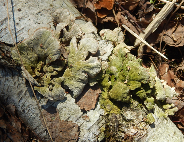 Снято 10 марта 2021 г. в Подмосковье, Подольский р-н, окр. села Быковка в берёзовой роще. На почве трухлявый ствол берёзы. Это грибы или лишайники? Это один вид или разные? Растут рядом на одном суку.