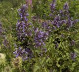Многолетник. Высокое р. с косым, нетолстым, деревянистым, плотным корнем, без клубневидных утолщений; ст. немногочисленные и даже одиночные, 50—150 см выс., (1.5)3—6.5 мм толщ., прямые, резко четырехгранные, довольно густо и коротко пушистые под соцветиями, а ниже почти голые или с редкими волосками, ветвистые от самого основания или лишь в верхней части, редко простые; нижние пазушные ветви короткие, стерильные, остальные фертильные, (3)5—35 см дл., некоторые ветвистые; л. тонкие, стеблевые до 8 см дл. и 4.5 см шир., яйцевидные или продолговато яйцевидные до почти ланцетных, б. ч. с сердцевидным основанием, острые, городчато-зубчатые, сверху темнозеленые, не густо усаженные короткими волосками, снизу сизоватые, более густо, иногда сплошь, коротко пушистые; чрш. у нижних листьев до 15—20 мм дл., у верхних всего 2—3 мм дл. Цв. в б. м. многоцветковых полузонтиках, расположенных на концах стебля и его верхних пазушных ветвей в виде рыхлых удлиненных кистей, образующих общее метельчатое сцв.; полузонтики б. ч. сложные, на цветоносах 2—3(5) см дл., верхние сближенные; нижние прицветные л. подобны верхним стеблевым, верхние, как и кроющие л. полузонтиков, ланцетно-линейные, прицветникообразные; прицв. линейные или почти шиловидные, в 3—4 раза короче чашечки, сине-фиолетовые, коротко ресничатые и мелко железистые; чшч. (8.5)9.5—10.5 мм дл., фиолетово-синяя, густо усаженная очень мелкими головчатыми железками, а по жилкам оттопыренными или б. м. прижатыми, очень короткими, простыми волосками, зубцы узко треугольные или треугольные, заостренные или острые, в два-три раза короче трубки; вн. (14)16—18 мм дл., фиолетово-синий, пушистый, тонкая часть трубки из чашечки не высовывается, шейка удлиненная; верхняя губа 2.5—3.5 мм дл., на 1/2—1/3 рассечена на тупые кверху расширенные лопасти; средняя лопасть нижней губы 4—7 мм дл. и 7—8.5 мм шир., крупнозубчатая, боковые лопасти широко треугольные, 2.5—3 мм дл. и 1.3—1.5 мм шир., задние тыч. и стлб. немного превышают верхнюю губу; орешки широко эллипсоидальные, трехгранные, 1.75—2 мм дл., 1—1.25 мм шир., темнокоричневые, с редкими плоскими неправильной формы бугорками. Цв. 2/2, VI—VIII; пл. с 1/2 VII.