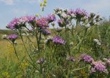 Многолетник. Ст. полый, прямой, высокий, 1—2 м дл. и 1 см толщ., ребристо-угловатый, ребра часто красноватые, особенно в верхней части, ст. слабо опушенный и усаженный сидячими блестящими железками, позднее оголяющийся, внизу простой, от середины или выше ветвистый, ветви торчащие под острым углом; нижние л. ко времени цветения растения обычно уже увядшие, продолговатоэллиптические, заостренные, при основании суженные в черешок, почти цельнокрайние или неравно-крупно-зубчатые; средние стеблевые жесткие, ланцетные, острые, цельнокрайние, к основанию суженные, сидячие или почти сидячие, не низбегающие на стебель, 6—15 см дл. и 1—4 см шир., с обеих сторон покрытые короткими, жесткими, ворсинчатыми волосками, с нижней, кроме того,— блестящими железками; верхние стеблевые л. уменьшенные, линейно-ланцетовидные; кз. многочисленные, собранные в густые щитки на вершине стебля и ветвей и образующие высокое и широкое щитковидно-метельчатое соцветие; обертки черепитчатая, 1—1.2(1.5) см выс. и 0.5—0.7 см шир., плесневидно опушенная, с сидячими железками или без них; наружные лч. ее яйцевидные или продолговато-яйцевидные, на верхушке туповатые; внутренние продолговатые, тупые; все зеленоватые или в верхней половине, а также по краю окрашенные, с б. м. ясной средней жилкой, которая у внутренних листочков обертки большей частью скрыта опушением; цвтл. густопленчатое; пленки линейно-шиловидные, мелкие, около 3 мм дл. Цв. фиолетово-лиловые, около 1.4 см дл.; узкая часть трубки около 0.7 см дл.; расширенная часть с долями отгиба около 0.7 см дл.; придатки пыльников с пучком длинных шерстистых волосков; хохолок двойной; наружные щетинки его зазубренно-шероховатые, ломкие, мелкие, около 3 мм дл., внутренние длинноперистые, около 0.8—1 см дл.; смк. гладкие, сжатые, около 0.7—0.8 см дл., почти равные по длине хохолку. VII—VIII.