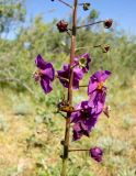 Botanical descriptionТравянистый многолетник. Pастение, несущее в нижней части б. м. жесткие волоски, вверху б. м. густо покрытое железками; корень кверху несколько утолщенный; стебель 30—100 см выс., прямостоячий, тонкий, цилиндрический или слегка, узловатый, с немногими листьями или почти безлистный, к верхушке иногда немного разветвленный; в нижней части усажен членистыми или согнутыми волосками, без железок или с немногими железками, кверху, как и по всему соцветию, б. м. густо усажен железистыми волосками; листья почти все прикорневые, черешки 4—40 мм дл., пластинка прикорневых листьев 4—10 см дл., 2—10 см шир., почти сердцевидная или продолговато-яйцевидная, по краю отдаленно крупногородчатая или почти цельнокрайняя, с обеих сторон покрыта рассеянными волосками; стеблевые листья очень немногочисленные или их нет вовсе, они значительно меньших размеров, с обеих сторон б. м. опушенные; нижние стеблевые листья продолговатые или продолговато-ланцетные, обыкновенно на коротком черешке; верхние сидячие, нередко почти стеблеобъемлющие. Соцветие — простая негустая кисть, иногда имеются боковые ветви; цветки всегда одиночные; прицветники обыкновенно ланцетные, острые, иногда почти щетинковидные, реже яйцевидно-треугольные и зубчатые при основании, короче цветоножек при плодах; цветоножки при плодах 10—30 мм дл., тонкие, отстоящие; чашечка 3—6 мм дл., железистоволосистая разделенная до основания на эллиптические или продолговатолинейные доли; венчик фиолетовый (очень редко белый), 25—30(35) мм в диам., без прозрачных точек, снаружи голый, реже железистоволосистый; нити всех тычинок усажены длинными, фиолетовыми, сосочковидными волосками; на верхних тычинках опушение иногда белое; пыльники все почковидные; столбик голый или при основании с немногими железками; рыльце полушаровидное; коробочка 4.5—6 мм дл., широко пирамидально-обратнояйцевидная, островатая, реже шаровидно-эллипсоидная, тупая, голая или с немногими железками. Цветение в VI—VII. На степях, как луговых, так и более сухих, иногда по долинам рек. Как заносное, заходит далеко на север. — Европ. ч.: Кар.-Лапл. (заносное в Хибинах), Прибалт., Верх.-Волж., Волж.-Кам., Верх.-Днепр., Сред.-Днепр., Волж.-Дон., Заволж., Бесс., Причерн., Крым, Ниж.-Дон., Ниж.-Волж.; Кавказ: Предкавк., Даг., Вост. и Южн. Закавк., Тал.?; Зап Сибирь: Верх.-Тоб. (Чкаловск. обл.), Ирт., Алт. (юг.); Ср. Азия: Арало-Касп., Дж.-Тарб., Тянь-Шан. Общ. распр.: Ср. Евр. (к югу до ср. Италии)?, Балк.-Малраз. (Ольты), сев. Иран, Джунг.-Кашг. Описан из средней Европы. Тип в Лондоне. Помеси: V. phoeniceum × pyramidatum (= V. eriocarpum Freyn et Sint., V. caucasicum Bornm.), V. phoeniceum × songoricum (= V. candelabrum Kar. et Kir.). К числу помесей этого вида относится также V. tauricum Hook. [Bot. Mag. tab. 3799 (1841); по общему виду рисунок очень напоминает V. spectabile, и растение это, вероятно, представляет помесь V. phoeniceum × spectabile]. Описано оно по культурному экземпляру из Эдинбургского ботанического сада и, судя по видовому названию, происходит из Крыма. Источник: Флора СССР. В 30 т / Гл. ред. акад. В. Л. Комаров; Ред. тома Б. К. Шишкин и Е. Г. Бобров. — М.—Л.: Изд-во АН СССР, 1955. — Т. XXII. — С. 168—169. Other informationПомеси: К числу помесей этого вида относится также v. tauricum Hook. [Bot. Mag. tab. 3799 (1841); по общему виду рисунок очень напоминает Verbascum spectabile, и растение это, вероятно, представляет помесь Verbascum phoeniceum × spectabile]. Описано оно по культурному экземпляру из Эдинбургского ботанического сада и, суд