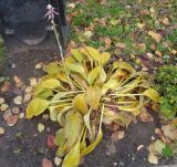 Hosta albomarginata. Бутонизирующее растение в осенней окраске. Тверская обл., г. Тверь, городской сад, клумба. 16 октября 2019 г.