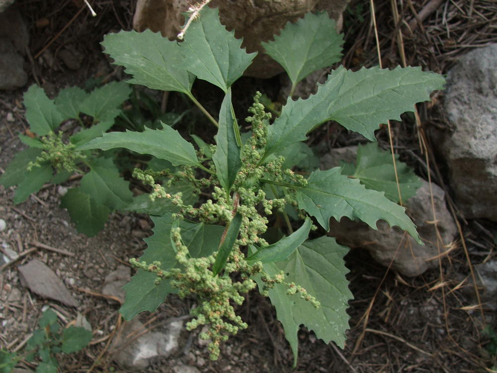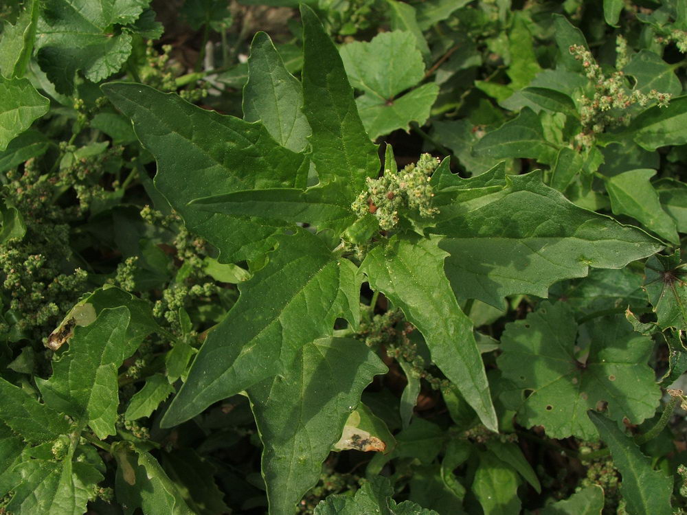 Часто верхние листья мари стенной похожи на листья мари красной, нижние обычно шире и срезанны в основании.Мне видится красная, а если знающие murale не по наслышке видят ее и уверены, что у этого вида могут быть так глубоко прорезаны края листьев, то давайте будем считать, что я не прав. |