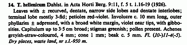 | Владимир Папченков | Чего-то я не понимаю. Фотографии такого растения Павлом уже выкладывались на форум и Юрием Константиновичем они были определены как T. hellenicum. По фенологии этого одуванчика такое определение выглядит логичным, но где здесь узкие, горизонтально расположенные боковые доли, где дополнительные дольки, где трехлопастная конечная доля и где светло-желтые цветки? |