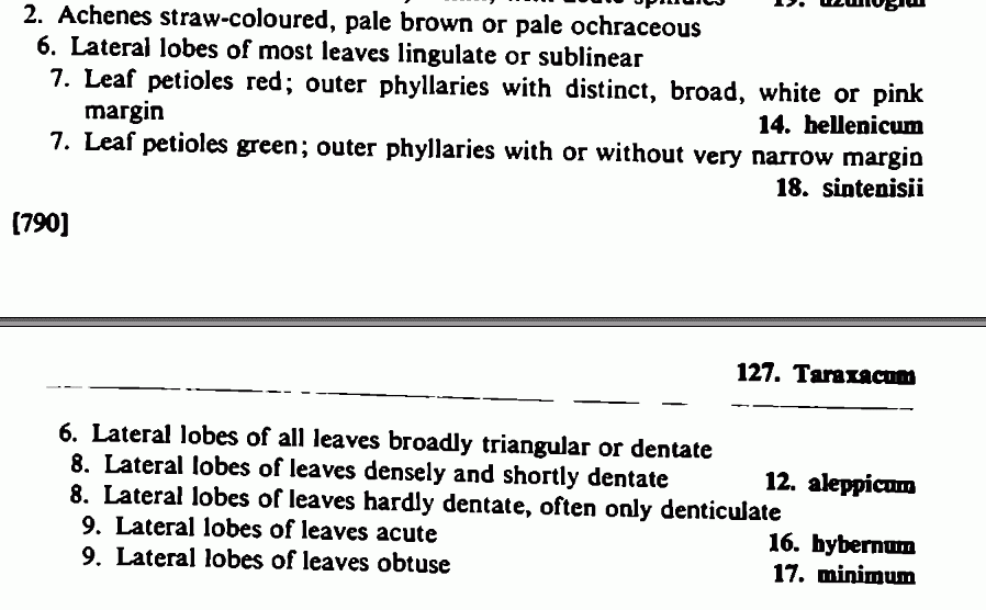 | Юрий Пирогов | На мой взгляд, боковые доли обсуждаемого вполне можно называть языковидными, а никак не широко-треугольными, хотя трёхраздельных терминальных долей здесь не наблюдается. Рассматривая весь комплекс крымских образцов, приходишь к выводу, что достоверно разделить их на два вида не получается (интересен вот этот одуванчик: , жаль не видно терминальных долей). Но как тогда быть со сроками цветения?
