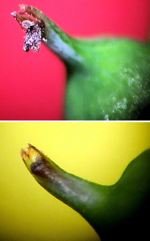 В определителе указаны раздвоенный носик мешочка и пурпурное пятно на носике. Два снимка на коллаже, потому что на одном пятно чёткое, на другом носик убедительно раздвоен.А в чём смысл делать два изображения в виде коллажа? |