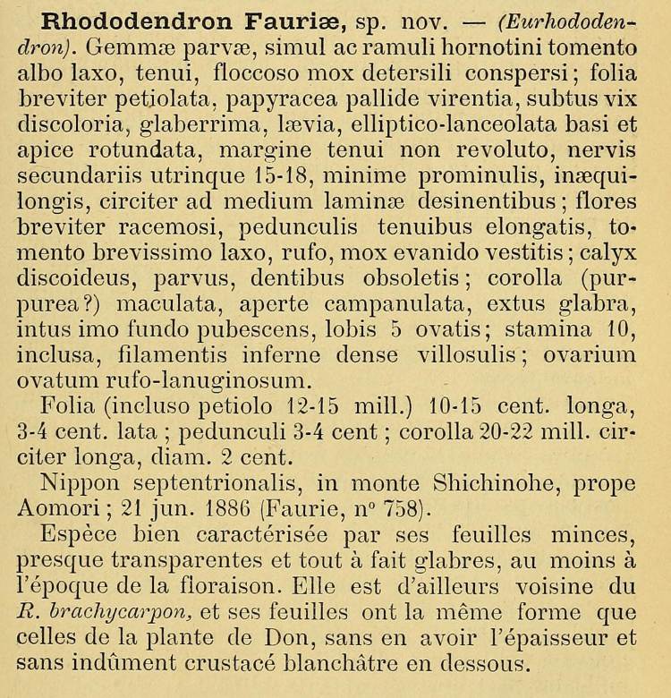 Rhododendron Fauriae, sp. nov. — (Eurhododendron). Gemae parvae, simul ac ramuli hornotini tomento albo laxo, tenui, floccoso mox detersili conspersi; folia breviter petiolata. papyracea pallide virentia, subtus vix discoloria, glaberrima, laevia, elliptico-lanceolata basi et apice rotundata, margine tenui non revoluto, nervis secundariis utrinque 15-18, minime prominulis, inaequilongis, circiter ad medium laminae desinentibus ; flores breviter racemosi, pedunculis tenuibus elongatis, tomento brevissimo laxo, rufo, mox evanido vestitis ; calyx discoideus, parvus, dentibus obsoletis ; corolla (purpurea?) maculata, aperte campanulata, extus glabra, intus imo fundo pubescens, lobis 5 ovatis; stamina 10, inclusa, fîlamentis inferne dense villosulis ; ovarium ovatum rufo-lanuginosum.