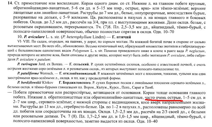 | Владимир Папченков | Так ведь и я рассматривал те же самые снимки, и нигде такого глубокого рассечения не обнаружил, все укладывается в 1/2-1/3. Указания в 10м издании Маевского на то, что у P. arenastrm листья "очень часто острые" не нашел. В имеющейся у меня книге того же издания написано: листья "тупые или острые". Могу предположить, что Юрцевой пришлось к виду отнести и его гибриды, поэтому и появилась эта добавка про то, что листья могут быть острыми. А вообще проще так. То, что раньше (в пору моей молодости) называли гоцем птичьим, сейчас зовется горцем простертым, а то что было горцем разнолистным и монпелийским, стало горцем птичьим. |
