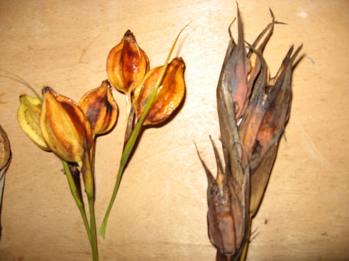 Верхушки побегов с плодами. Слева направо: Iris ensata Thunb., Iris graminea L., Iris carthaliniae Fomin. 02.04.2010.