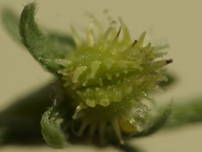 по плодам (эремы мелкие, шипики идут только одним рядом, короткие),