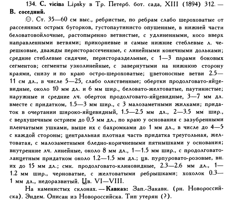 | Александр Бронсков | У Зернова что то круто напутано с C. vicina. У него написано, что у C. vicina придатки листочков обертки широкие пленчатые, по краям неправильно разорванные по центру с шипиком. Т.е. по сути, такие же как у sterilis, только с шипиком. На самом деле C. vicina относится к ряду Ovinae и у него, грубо говоря, придатки похожи на С. оvina и С. caprina. В прикрепленном файле описание C. vicina из Флоры СССР.