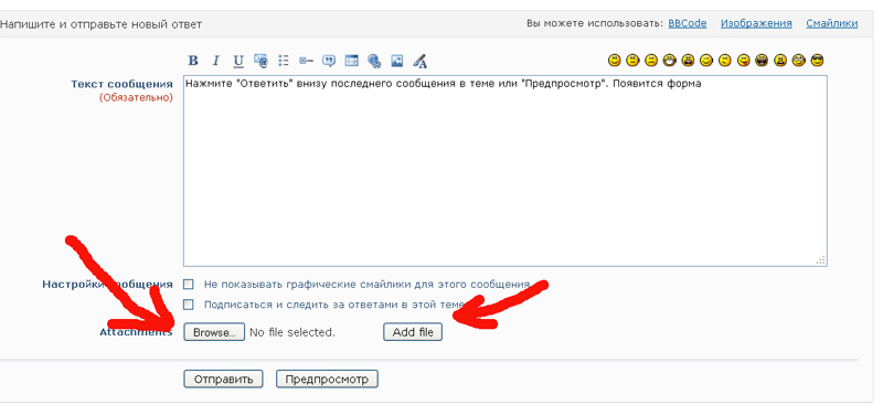 | Лена Глазунова | Нажмите "Ответить" внизу последнего сообщения в теме или "Предпросмотр". Появится форма:
