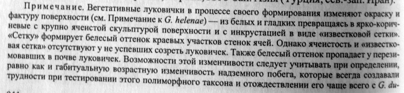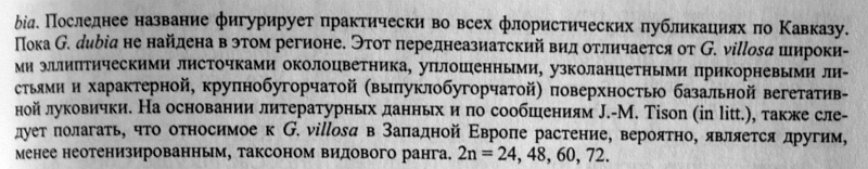 | Юрий Пирогов | Попытался разобраться с представлениями И. Г. Левичева о G. dubia. В статье из секции Didymobolbos указаны только G.tenuissima, G. bohemica, G. villosa. Причём про последнюю говорится "в первый год генеративной стадии одна-несколько групп луковичек нередко образуется в пазухах листьев на разных уровнях соцветия, в последующие годы образуется только одиночная, крупная базальная луковичка, до созревания - гладкая, созревшая - ярко коричневая, крупноячеистая со светлыми (наподобие "известковой сетки") гранями ячей". "Несколько групп луковичек ... в пазухах листьев на разных уровнях соцветия" - очень похоже на обсуждаемое растение. Возникает вопрос: действительно ли обсуждаемое и - одно и то же, только на разных стадиях развития? Как-то наборы изображений не подтверждают этого, или, может, я ошибаюсь?