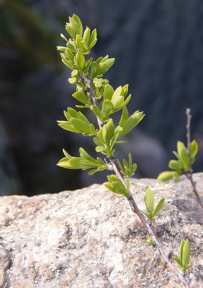Верхушка ветки с развивающимися боковыми побегами и бутонами. Украина, г. Запорожье, о-в Хортица, северный берег. 05.04.2014.