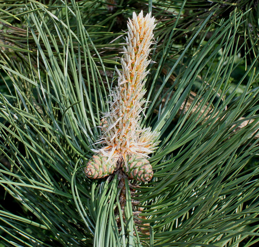 Молодой побег и молодые женские констробилы. Германия, г. Дюссельдорф, Ботанический сад университета. 04.05.2014.
